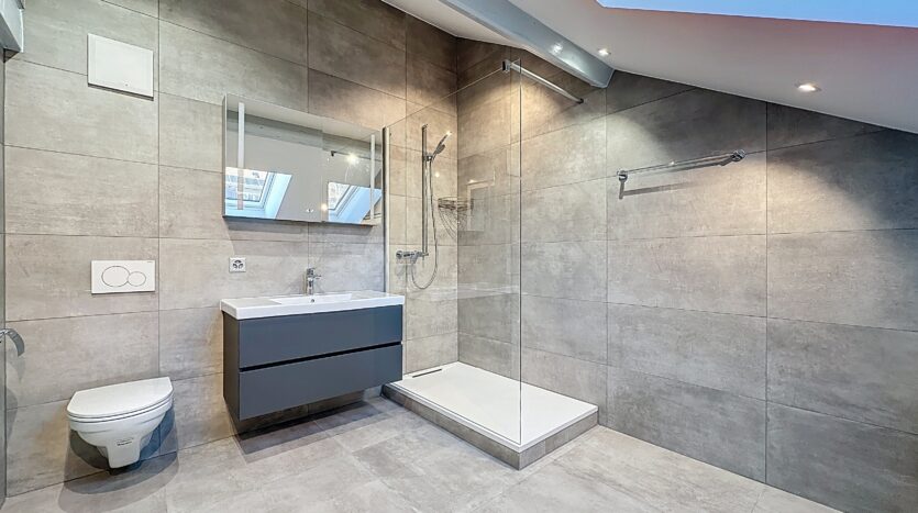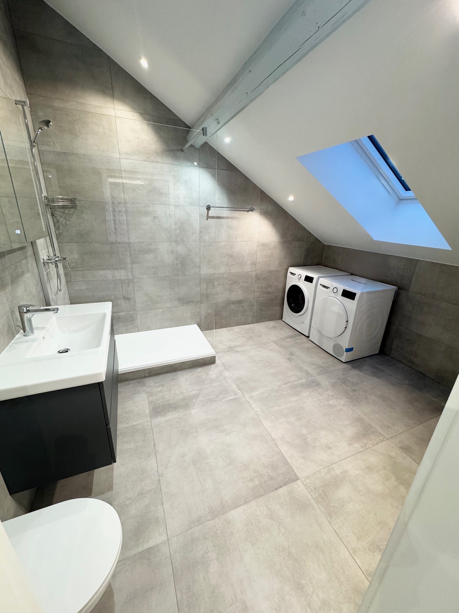 – Une salle de bains/WC avec douche à l’italienne et buanderie équipée (machine à laver le linge et sèche-linge)