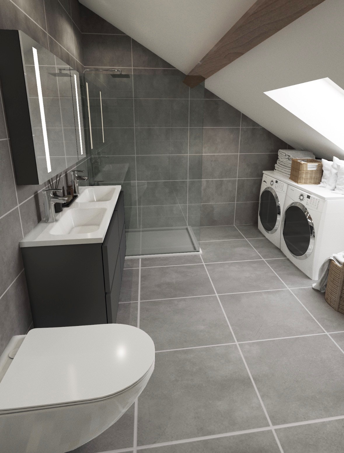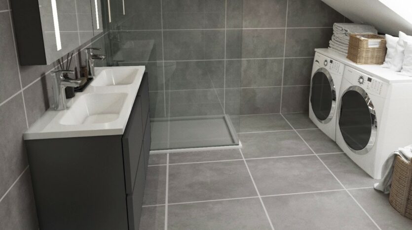 – Une salle de bains/WC avec douche à l’italienne et buanderie équipée (machine à laver le linge et sèche-linge)